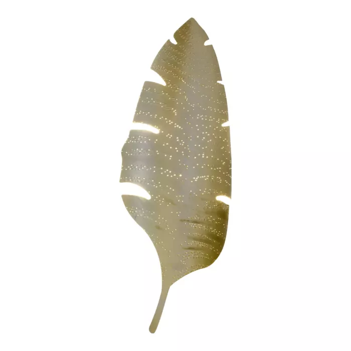 Inspirada no formato orgânico de uma folha tropical, esta arandela decorativa apresenta traços suaves, curvas delicadas e recortes estratégicos que permitem a passagem sutil da luz. Seu acabamento dourado fosco e textura perfurada criam um efeito luminoso encantador, projetando sombras elegantes nas paredes e destacando o visual da peça.